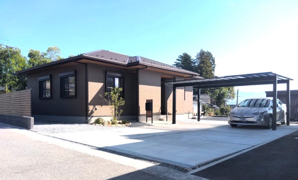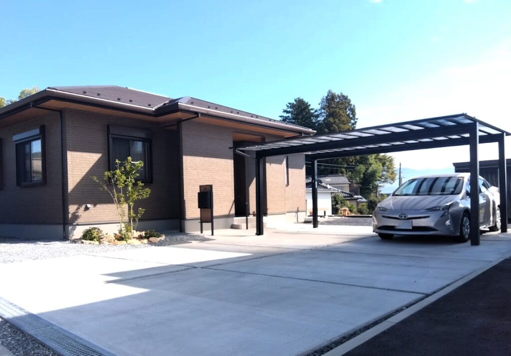2台用のカーポートに広い土間コンクリートが目を引きます