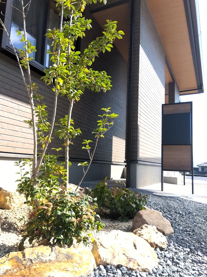 アプローチには機能門柱やドライガーデン風花壇の中にはシンボルツリーのソヨゴと低木のオタフクナンテンがとてもかわいいですよ